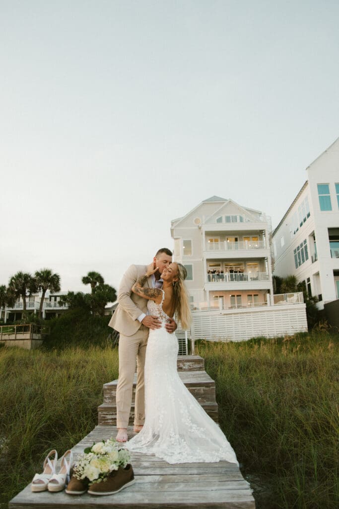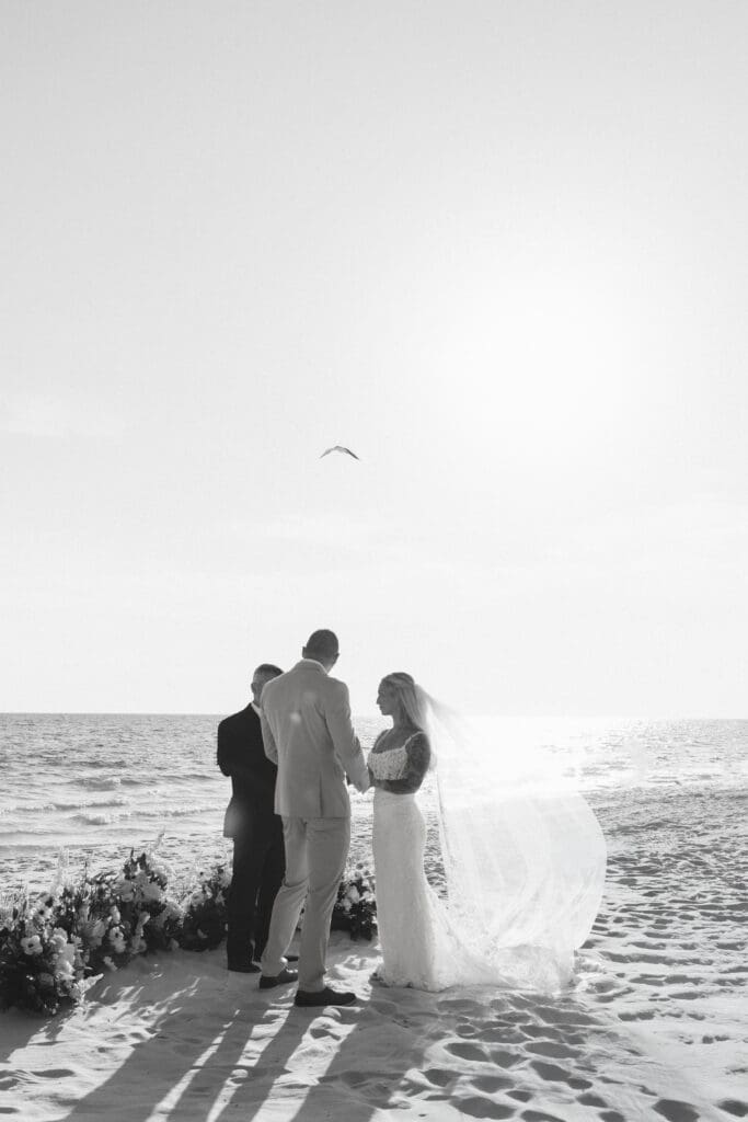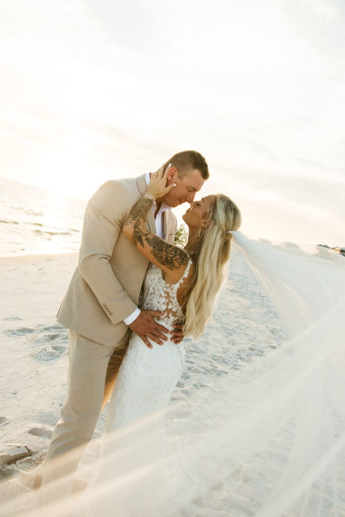 When they shared their first kiss as husband and wife, the wind lifted her veil just enough to make the moment feel cinematic — one of those unplanned details that make beach weddings along the Gulf Coast so magical.